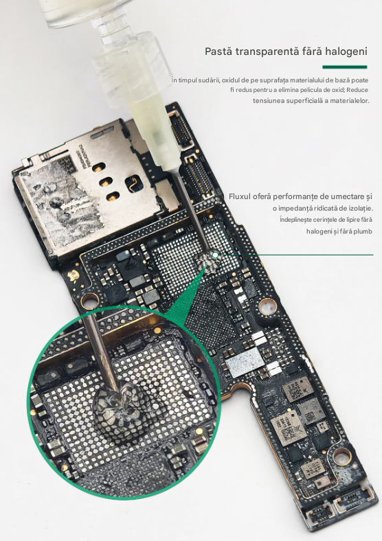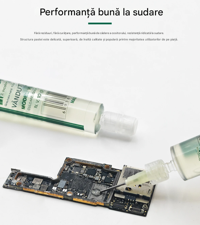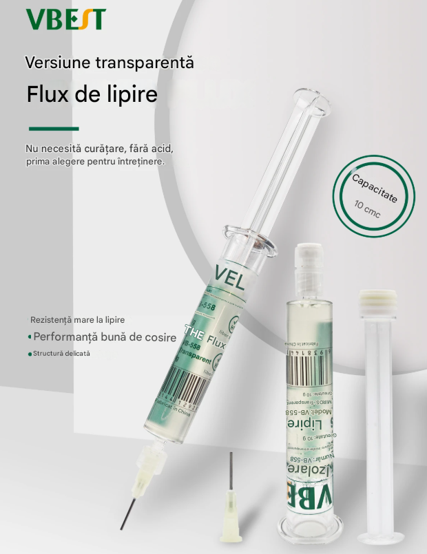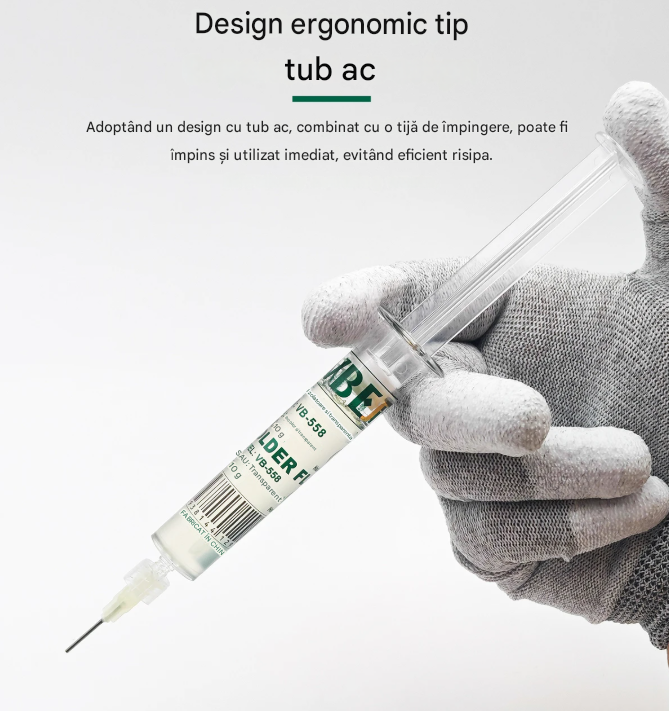 Pasta de lipire VB-558 in format seringa, usor de folosit chiar si de incepatori. Ajuta cositorul sa se prinda mai bine si face lipirea mai curata, fara sa lase murdarie sau reziduuri. Nu este acida si nu afecteaza componentele. Se aplica precis datorita acului, fiind ideala pentru reparatii la telefoane, laptopuri sau alte placi electronice.