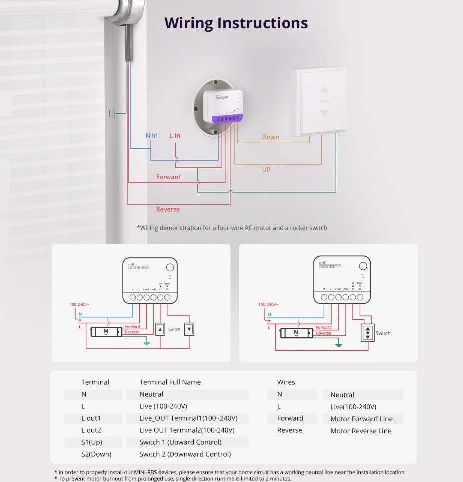 Datorita designului sau inteligent, Sonoff MINI-RBS se va potrivi in cutiile de instalare europene cu o adancime minima de 60 mm. Dimensiunile sale compacte permit o instalare discreta, fara a modifica infrastructura existenta. Integrarea perfecta cu cabluri cu 4 sau 5 fire (cu neutru, linie de deschidere si inchidere si masa) asigura o compatibilitate larga cu cele mai populare motoare de obloane.