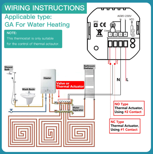 Termostatul inteligent WiFi varianta GA este destinat sistemelor de incalzire cu apa si controleaza actuatoare termice montate pe distribuitoare (NO sau NC), utilizate in special la incalzirea in pardoseala sau pe circuite de radiatoare. Acesta nu comanda direct centrala, ci actioneaza deschiderea si inchiderea circuitelor de apa calda in functie de temperatura ambientala setata. Controlul se realizeaza local sau de la distanta prin aplicatia Smart Life, cu memorarea setarilor chiar si in cazul intreruperii alimentarii.