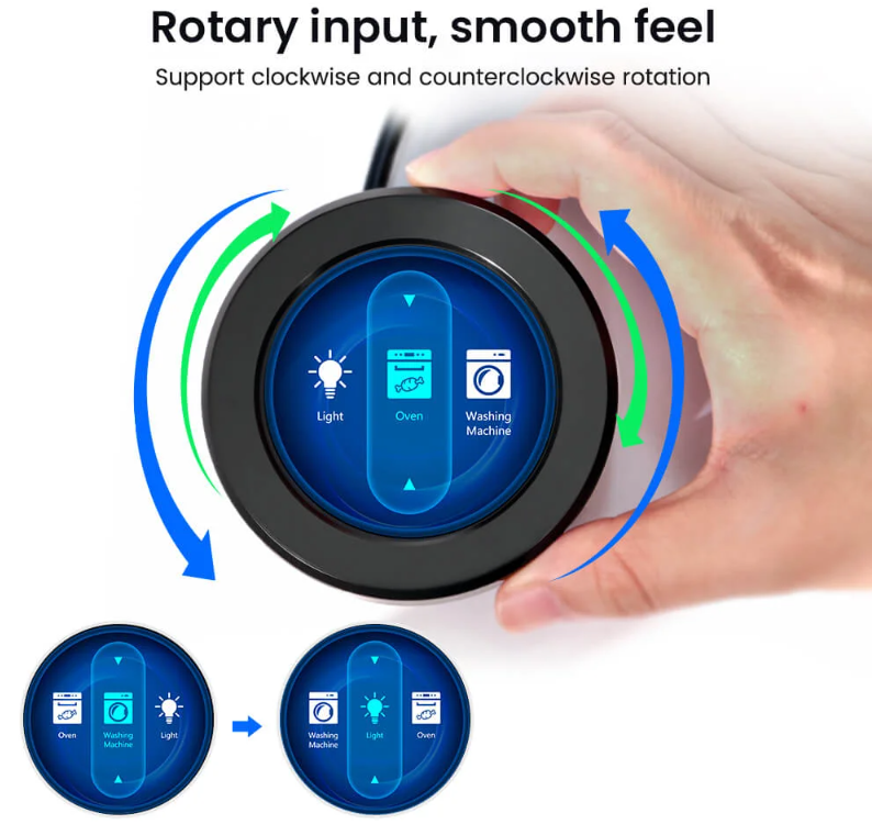 Mod de interactiune: Suporta intrare prin buton rotativ, rotire in sens orar, antiorar si apasare completa; poate ajusta volum, luminozitate etc.
