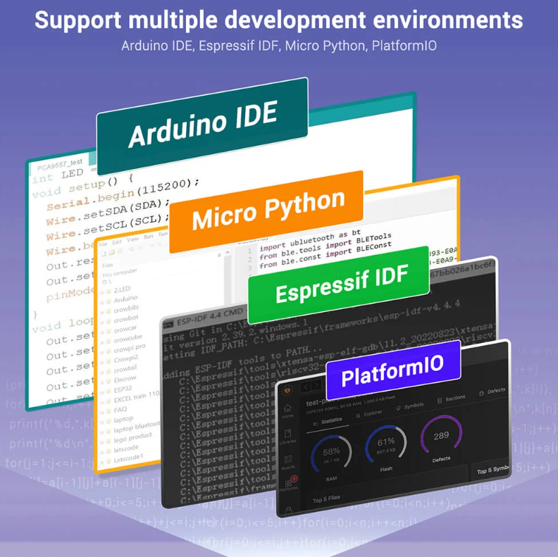 Compatibil cu Arduino IDE, Espressif IDF Micro Python si PlatformIO.