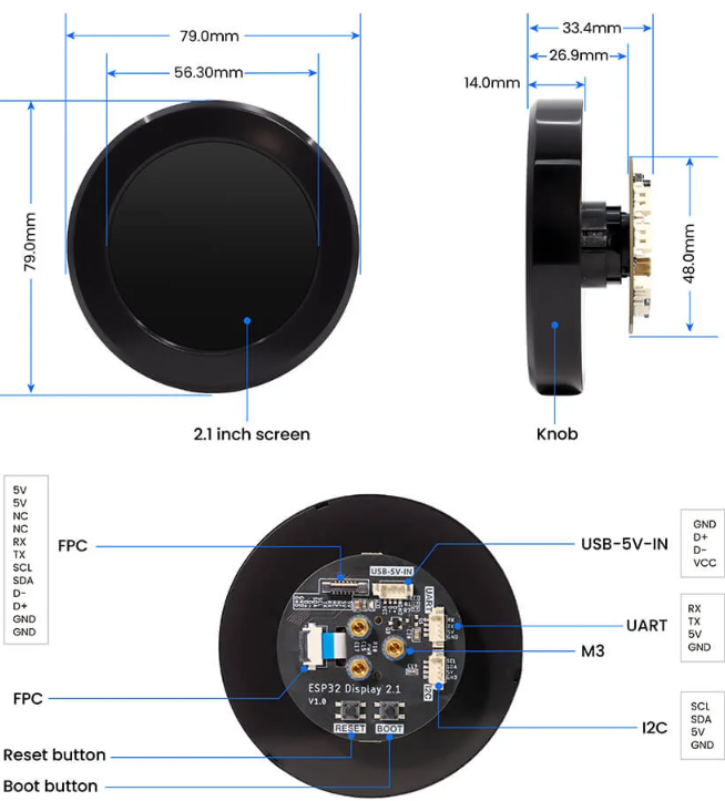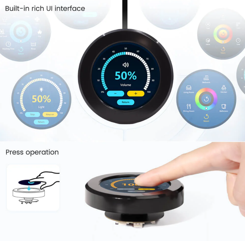 CrowPanel 2.1 inch ESP32 este un display rotativ inteligent, proiectat pentru interactiuni moderne si aplicatii avansate. Echipat cu ecran IPS rotund 480x480 si touch capacitiv, ofera o vizibilitate excelenta din orice unghi si o experienta tactila fluida. Butonul rotativ integrat permite control precis prin rotire si apasare, ideal pentru meniuri interactive, reglaje sau control rapid al parametrilor.