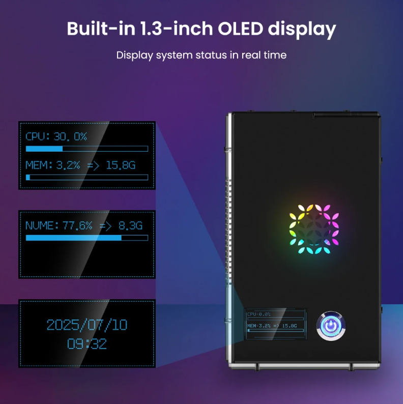 Ecran OLED integrat: Ecran de 1.3 inch pentru afisarea statusului sistemului in timp real.