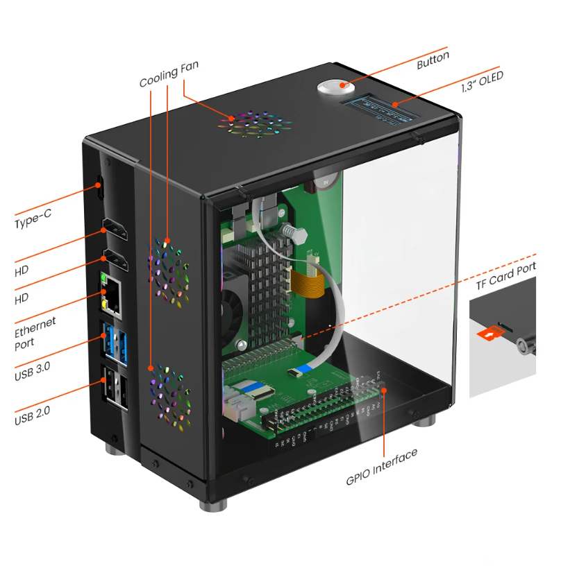 Aceasta carcasa Mini PC este o solutie DIY conceputa pentru Raspberry Pi 5. Conceptul de proiectare al sasiului este acela de a oferi utilizatorilor o platforma hardware integrata, cu performanta ridicata si usor de extins.