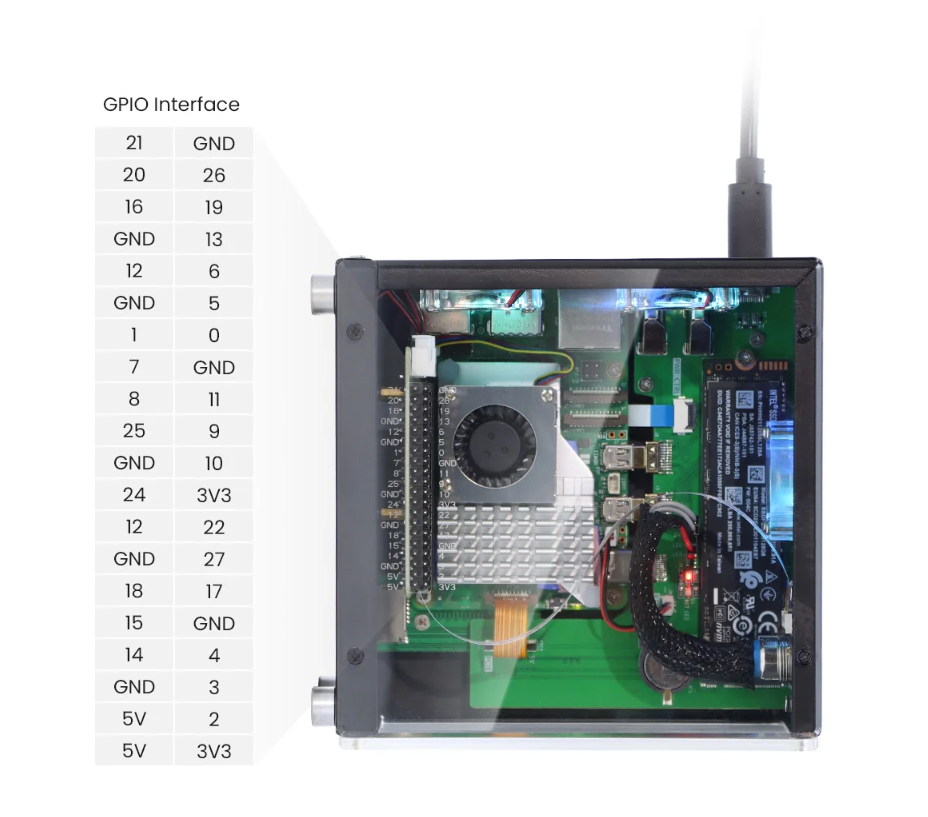 Pentru Raspberry Pi 5, carcasa include un slot PCIe M.2 intern, oferind suport pentru SSD-uri 2230, 2242, 2260 si 2280, permitand conectarea de unitati NVMe de mare viteza si capacitate.