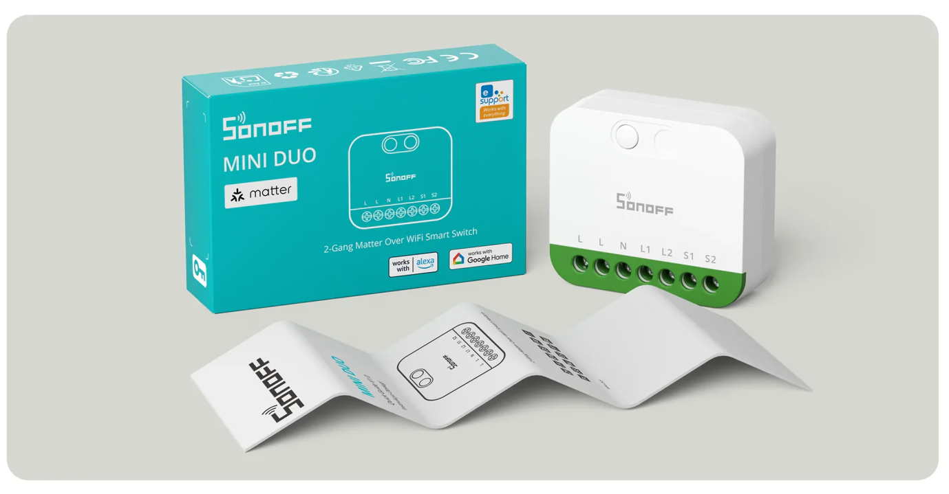 SONOFF MINI‑2GS Smart Wi‑Fi Switch with Matter este un intrerupator inteligent dual-canal Wi-Fi (cu doua relee) conceput pentru a transforma intrerupatoarele traditionale in puncte de control smart, perfect pentru controlul iluminatului sau a altor aparate electrice din casa, cu integrare in ecosisteme moderne de smart home.